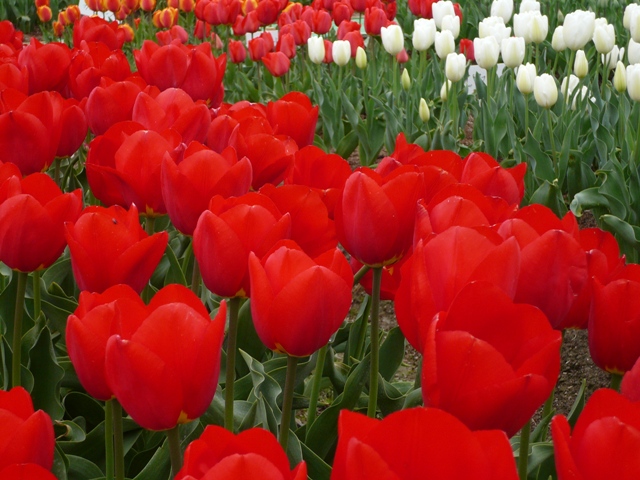畝ごとに色を分けていて、文字を作ったり、虹のように半円を描いたり、三角のタワーも2つあり、チューリップタワーはみごとでした